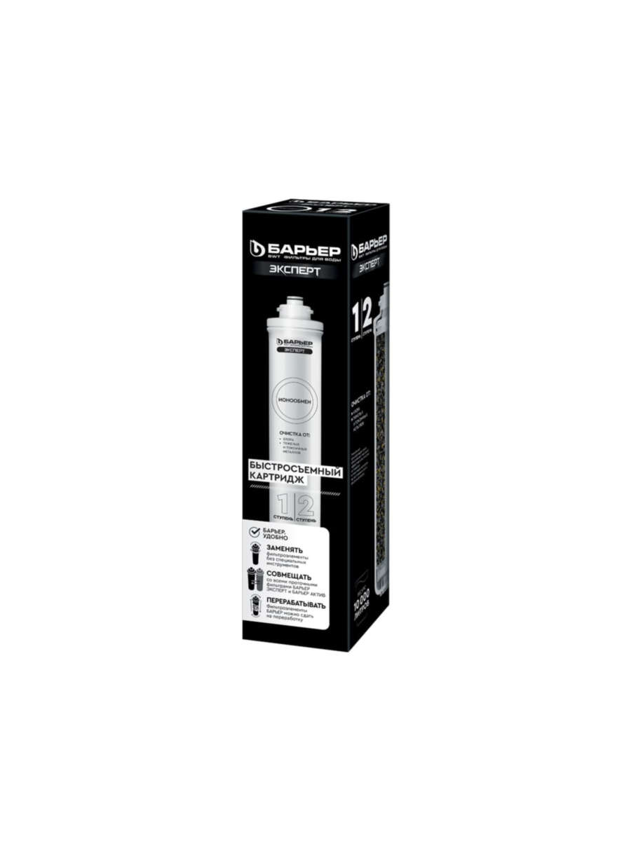 Ионообменный картридж Барьер Эксперт — это эффективное решение для комплексной очистки питьевой воды от вредных примесей. Четырёхкомпонентная смола, заключённая в прочный пластиковый корпус, обеспечивает глубокую очистку воды от тяжёлых металлов и хлора, делая её безопасной и приятной на вкус.