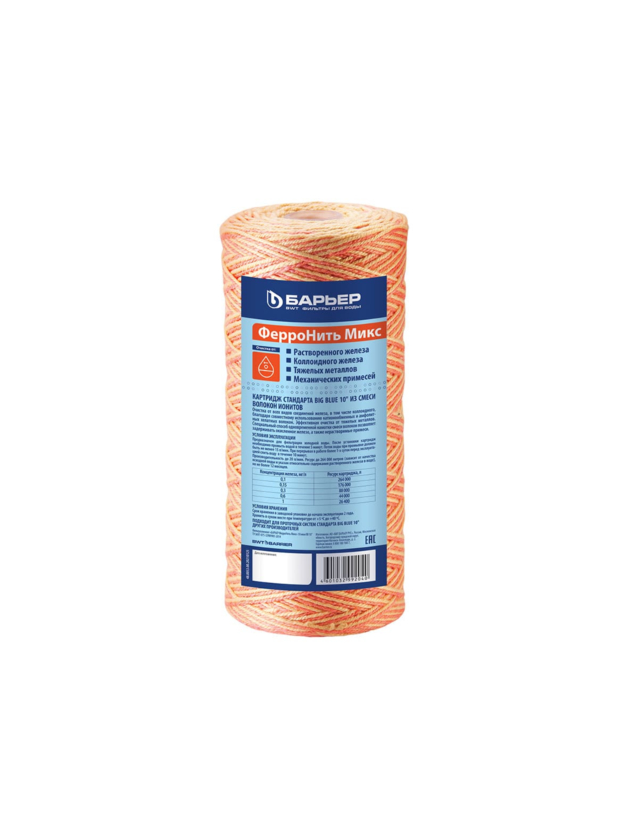 Фильтрующий элемент Барьер ФерроНить Микс BB10 разработан для глубокой очистки воды от растворенного железа и тяжелых металлов. Его конструкция сочетает в себе катионообменную и амфолитную нити, что обеспечивает высокую эффективность фильтрации и долговечность использования.