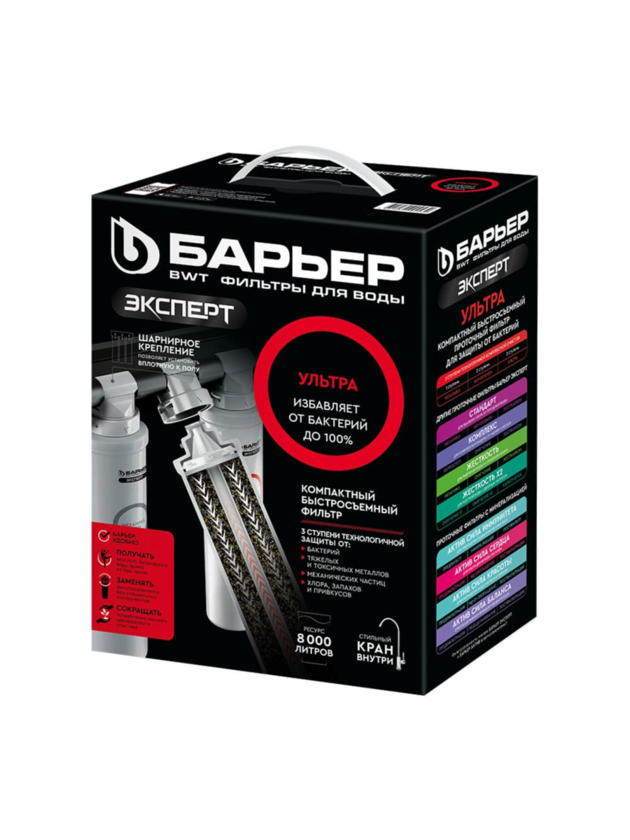 Фильтр Барьер Эксперт Ультра обеспечивает всестороннюю очистку воды от вредных примесей, включая песок, ржавчину, хлор, металлы и бактерии, делая её безопасной и вкусной для постоянного употребления.