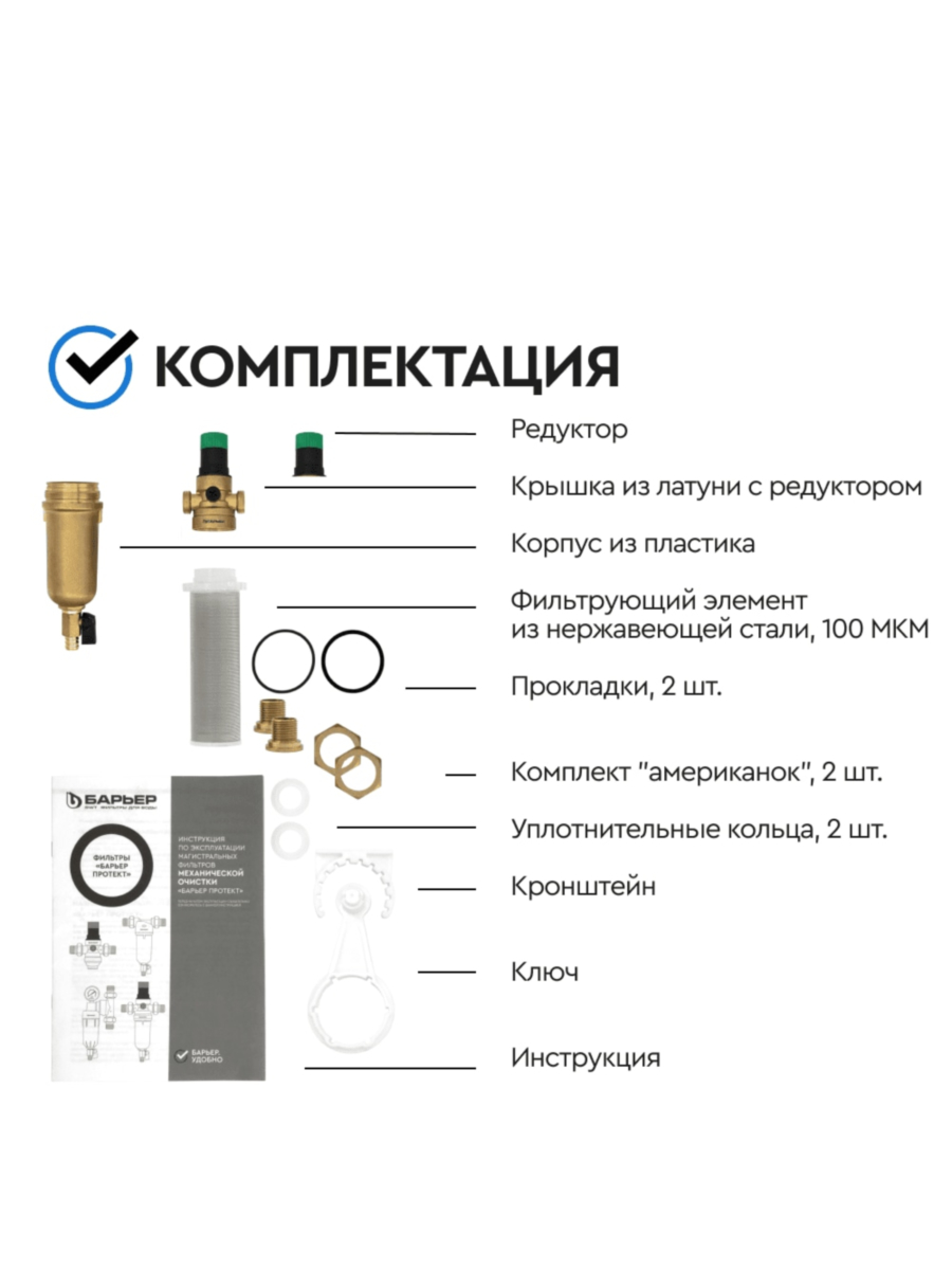 Полная информация о технических характеристиках и принципе работы фильтра Барьер Протект с редуктором давления 1/2 ХВС представлена в прилагаемой инструкции.