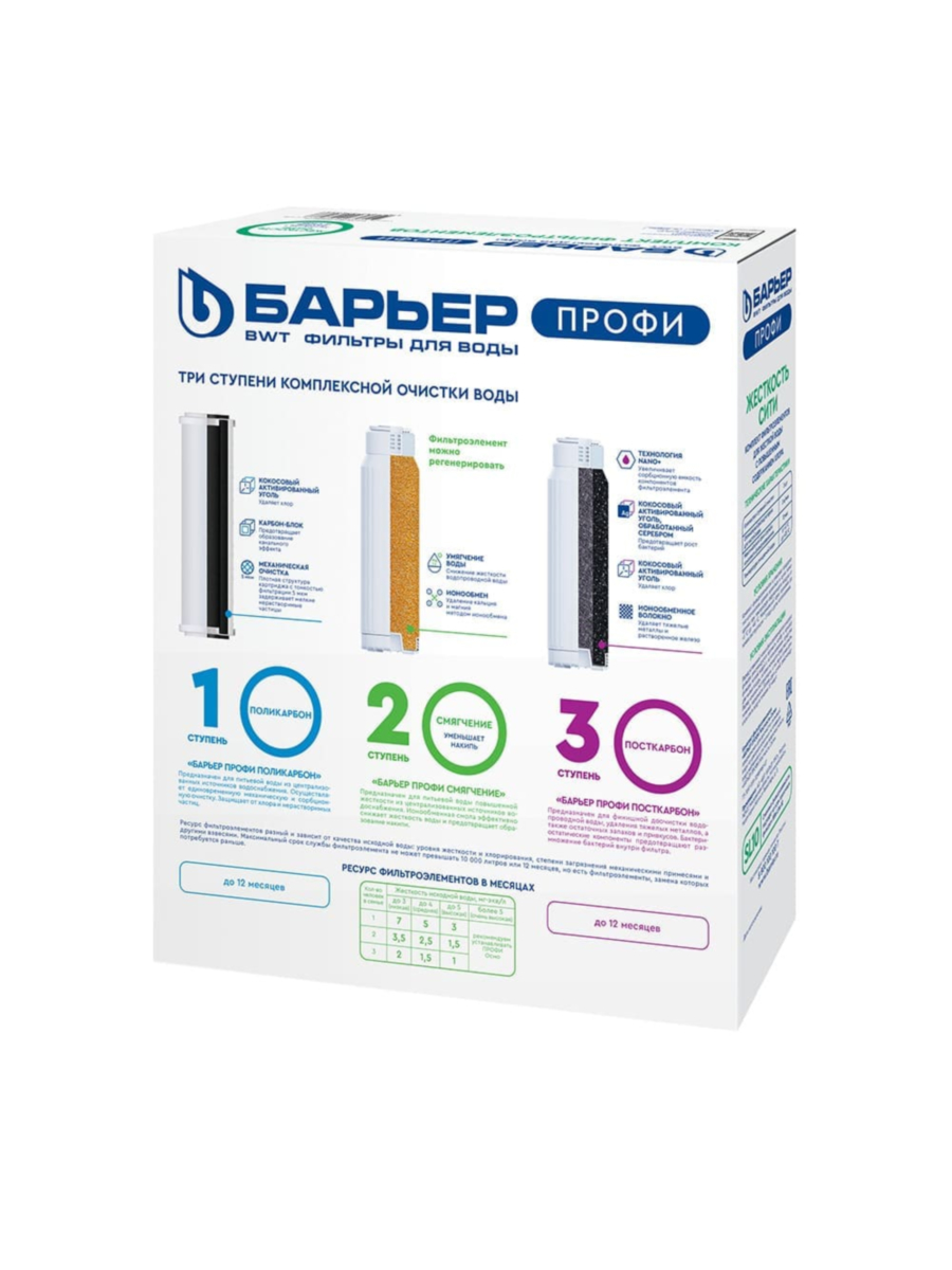 - Барьер Профи ПостКарбон — угольный картридж, завершающий процесс очистки, улучшая вкус и запах воды, а также удаляя остаточные примеси.