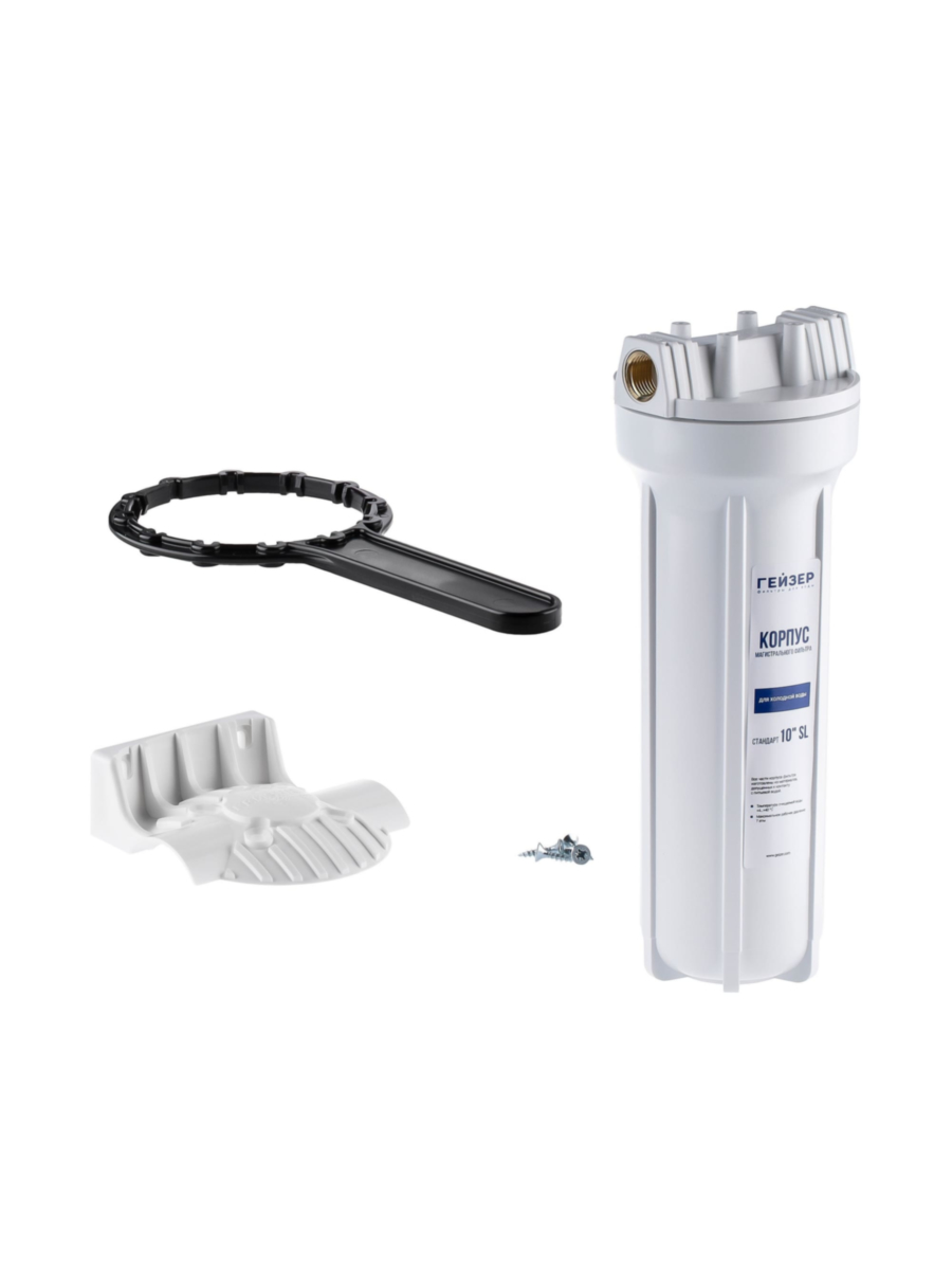 - В комплект входит фиксирующий кронштейн для настенного крепления и ключ для отвинчивания колбы, что облегчает замену фильтрующего элемента и техническое обслуживание.