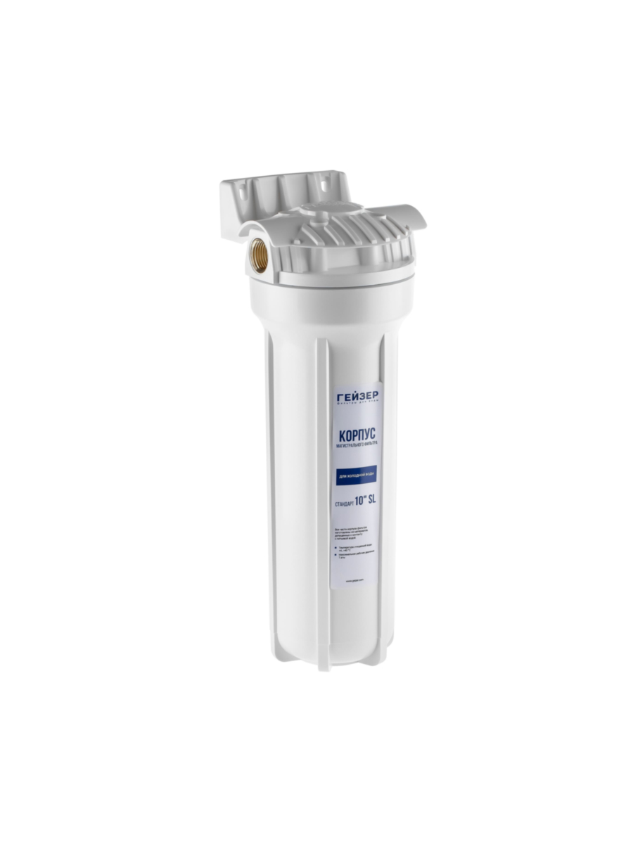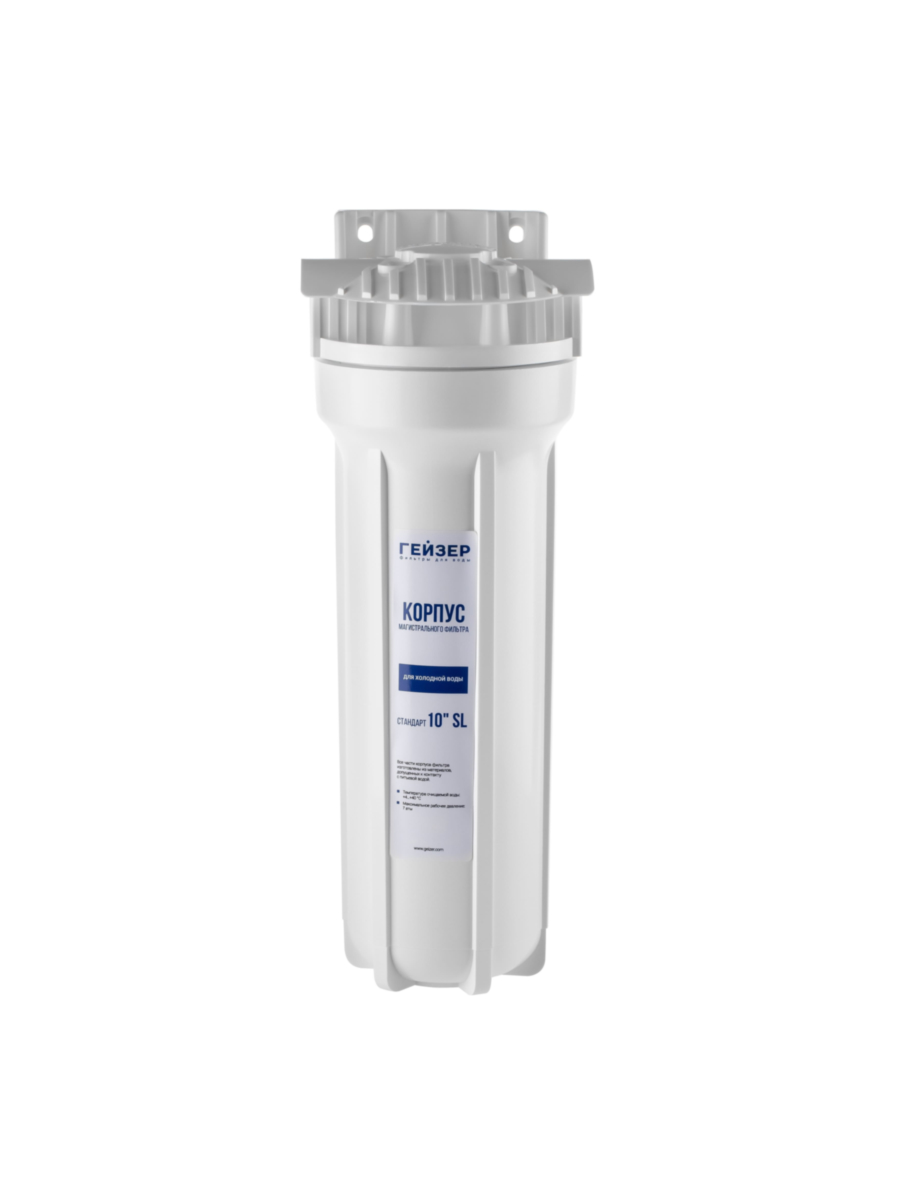 Корпус магистрального фильтра Гейзер 10SL 1/2 предназначен для профессиональной очистки холодной воды в частных и многоквартирных зданиях.