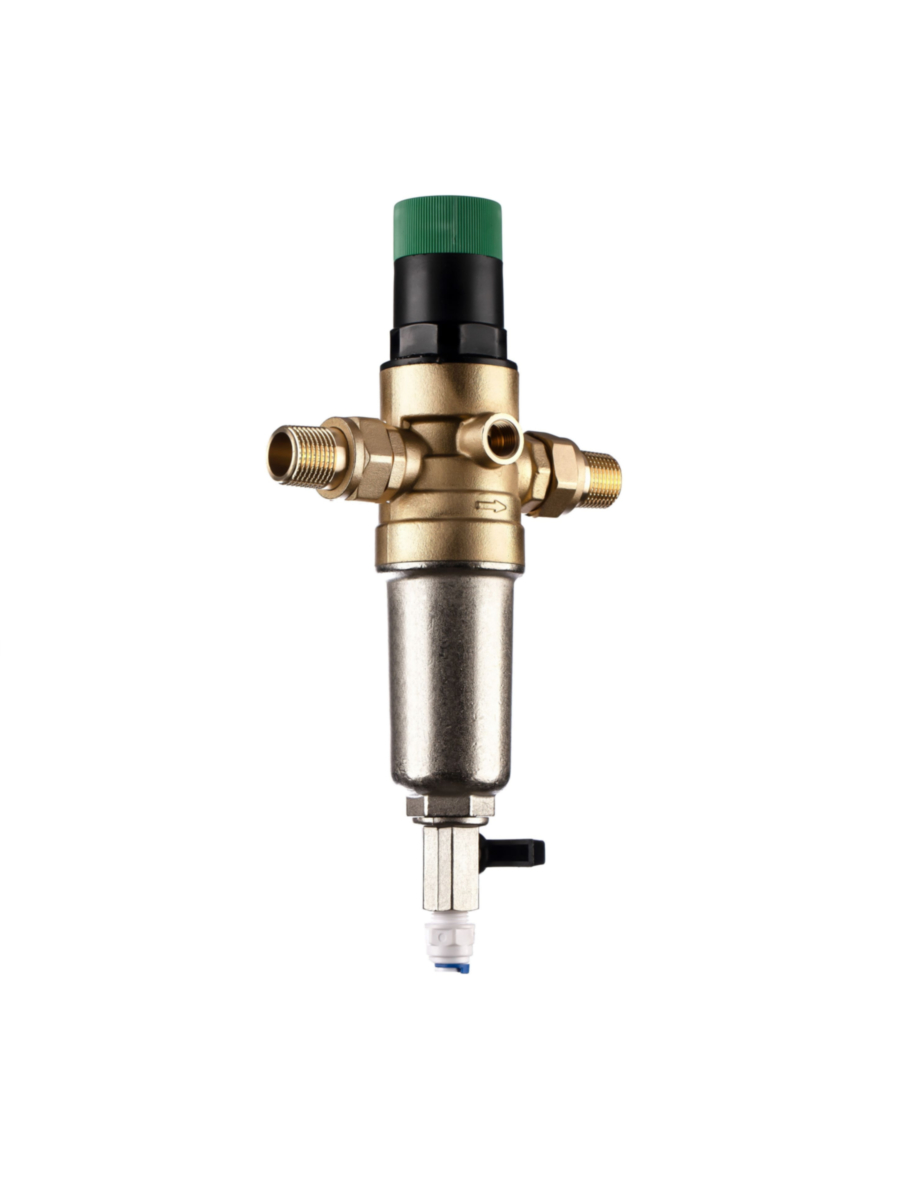 - Оснащен редуктором, регулирующим давление воды на выходе в диапазоне от 2 до 6 атм, что предотвращает гидроудары и нагрузку на бытовую технику и сантехнику.
