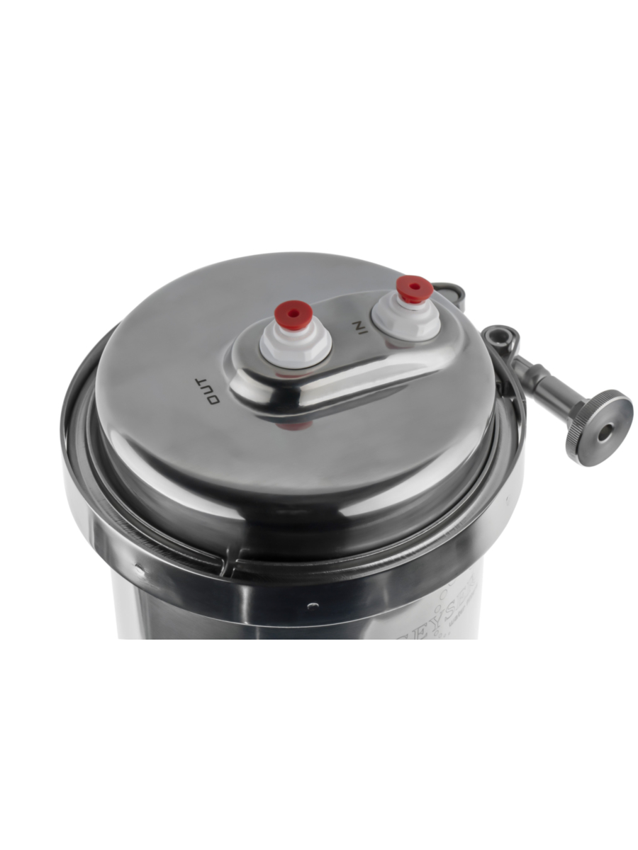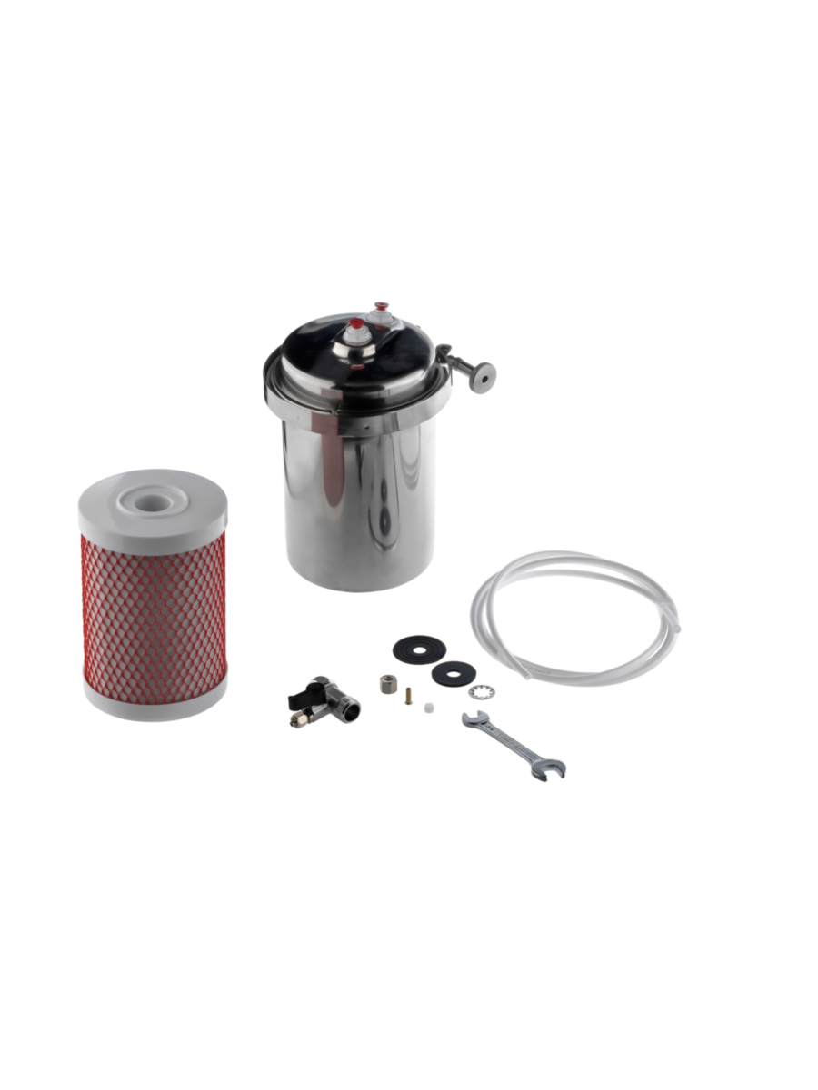 - Корпус фильтра изготовлен из нержавеющей стали и оснащен хомутом, обеспечивающим надежное закрытие крышки на колбе без необходимости использования дополнительных приспособлений.