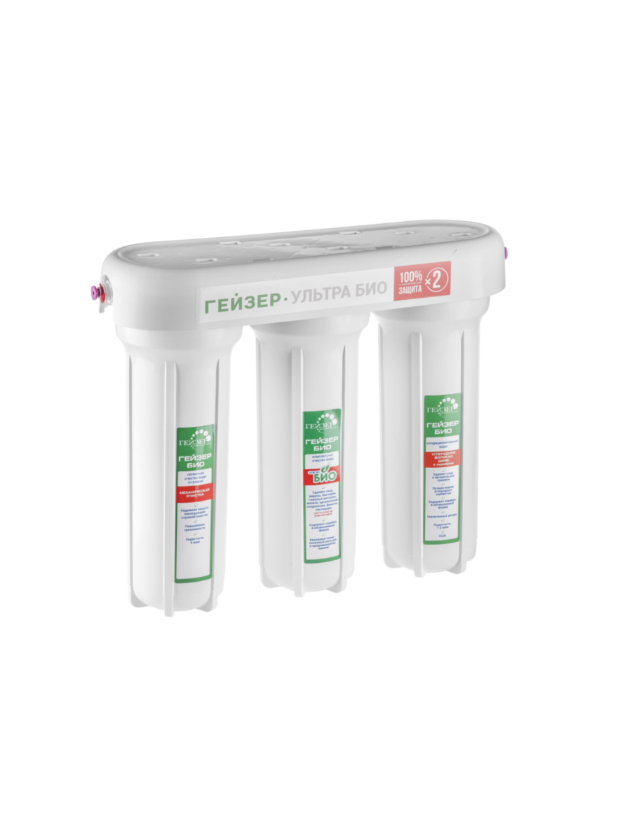 Фильтр Гейзер Ультра Био 411 собран из трех последовательно соединенных колб стандарта SL10, что обеспечивает оптимальную глубину очистки и возможность удобной замены фильтрующих элементов.