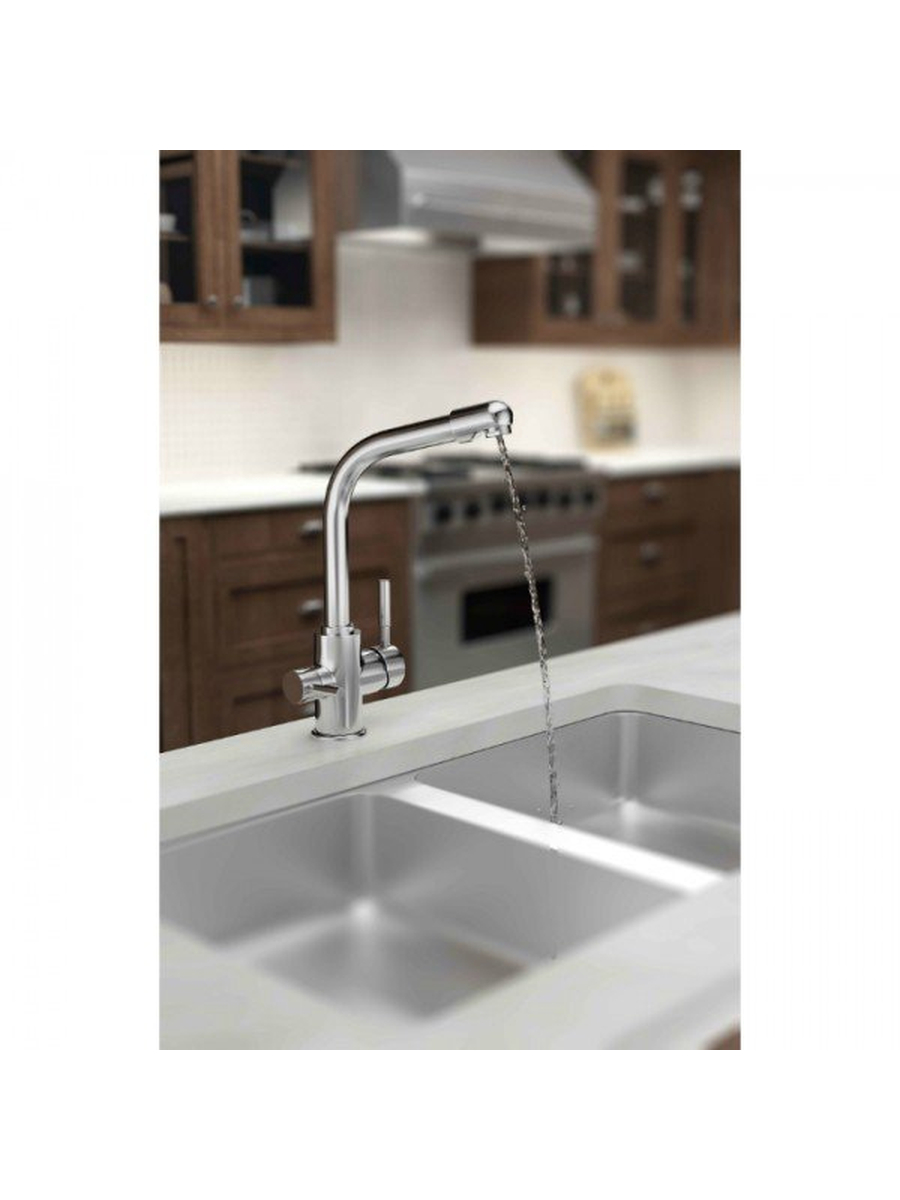 Качественный кухонный смеситель из нержавеющей стали предназначен для одновременного распределения водопроводной и фильтрованной питьевой воды. Смеситель оснащен переключателем, позволяющим легко регулировать подачу нужной воды без необходимости проделывания дополнительных отверстий в мойке или столешнице, что особенно актуально при использовании каменных покрытий, таких как гранит или керамогранит.