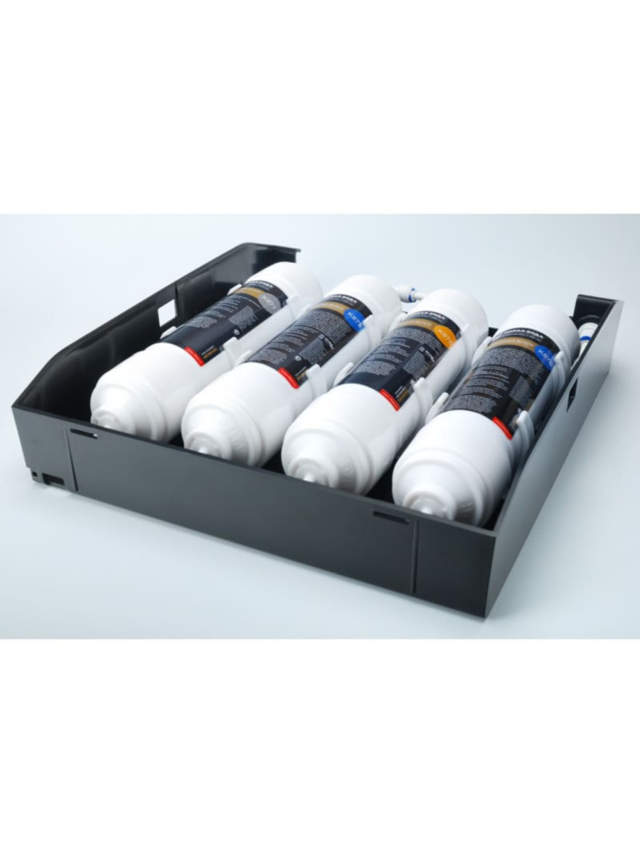 - Оснащен четырьмя картриджами: механическим, двумя сорбционными и умягчающим, обеспечивающими глубокое очищение воды от вредных примесей.