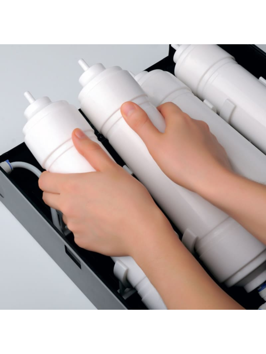 - Картридж K870 из прессованного угля обеспечивает финишную сорбционную и механическую очистку, удаляя остаточные следы хлор-органики, кондиционируя вкус и запах воды, а также задерживая мелкие частицы размером крупнее 1 мкм (ресурс: до 6000 литров).